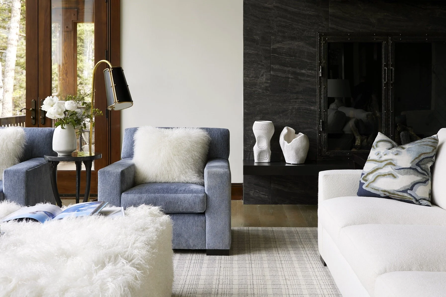 Softly textured items, like these furry pillows, make a minimalist space feel more comfortable. This seating area is from a vacation home we designed in Telluride, Colorado, which was recently published in Mountain Living magazine.