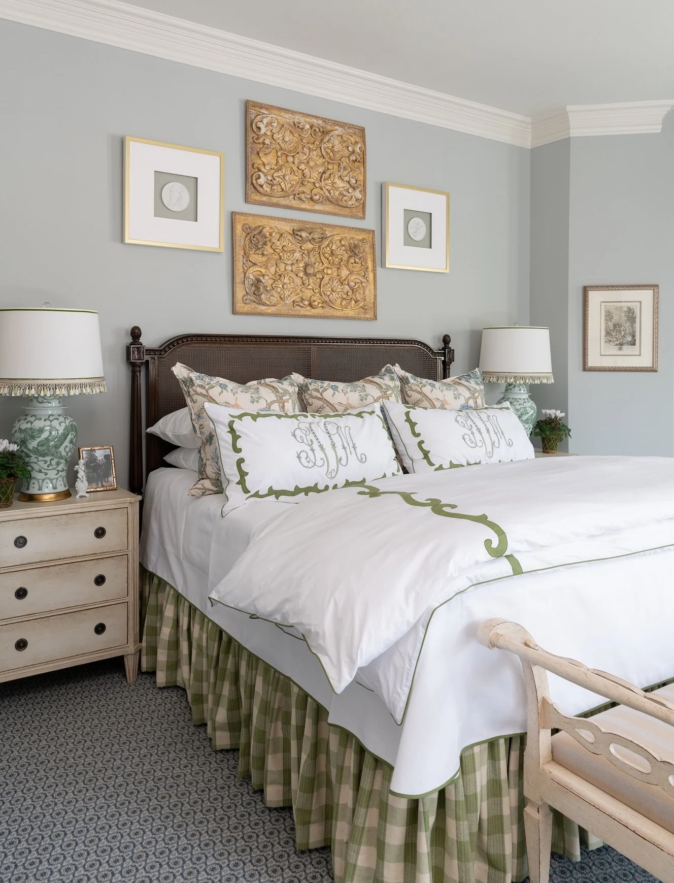 This green check bed skirt matches the green detailing on the duvet and pillows. Notice how the sleeping pillows are stacked and hidden behind the decorative pillows.