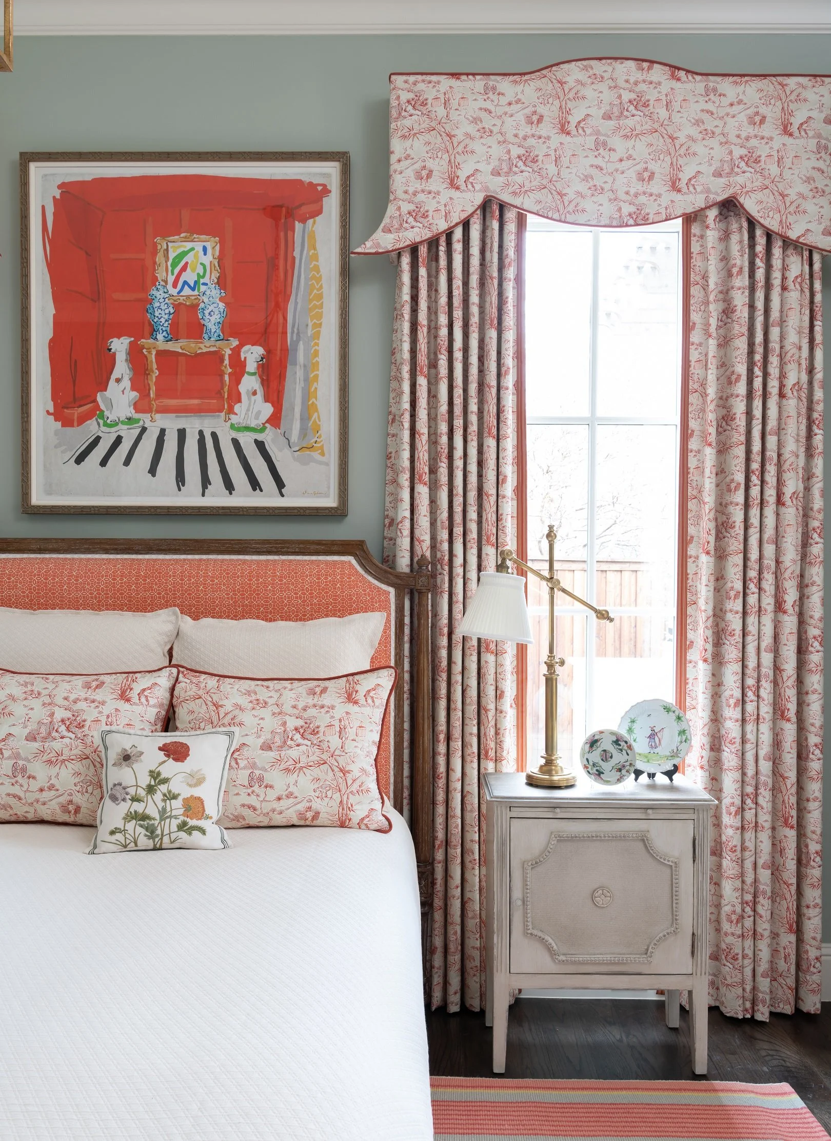 This is one of my all-time favorite bedrooms I’ve designed. The matelassé on the bed has a wonderful texture. The pillows have a layered look, with a hand-embroidered center pillow in front of a pair of Asian toile pillows. The upholstered headboard is within a stained French wood frame.