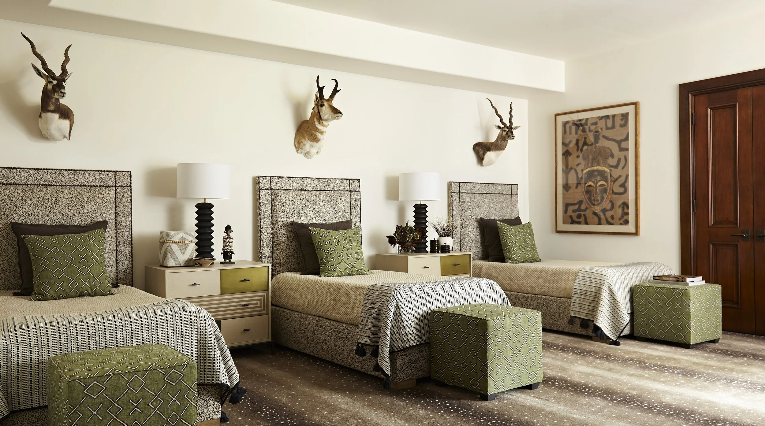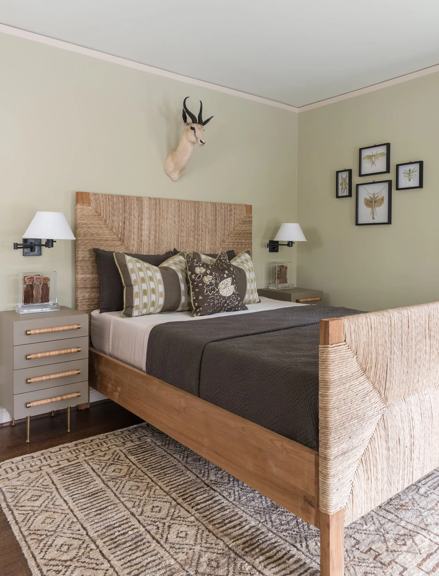 This Africa-themed guest bedroom in a Kessler Park home has a contemporary feel because of its simplicity and textural elements. The color scheme for the bedding is done in earth tones.