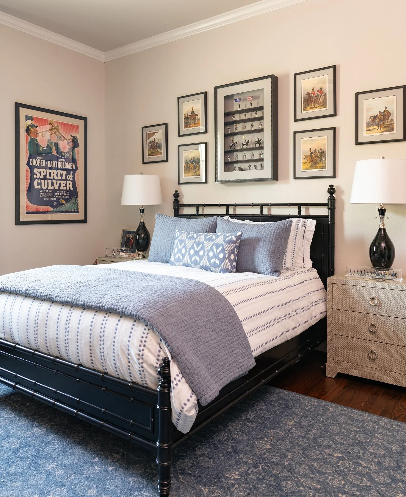 Blue-and-white is a classic color combination. It can instantly give bedding a refreshing and uplifting feel. Seen here is a boy’s bedroom from a Preston Hollow home we designed.